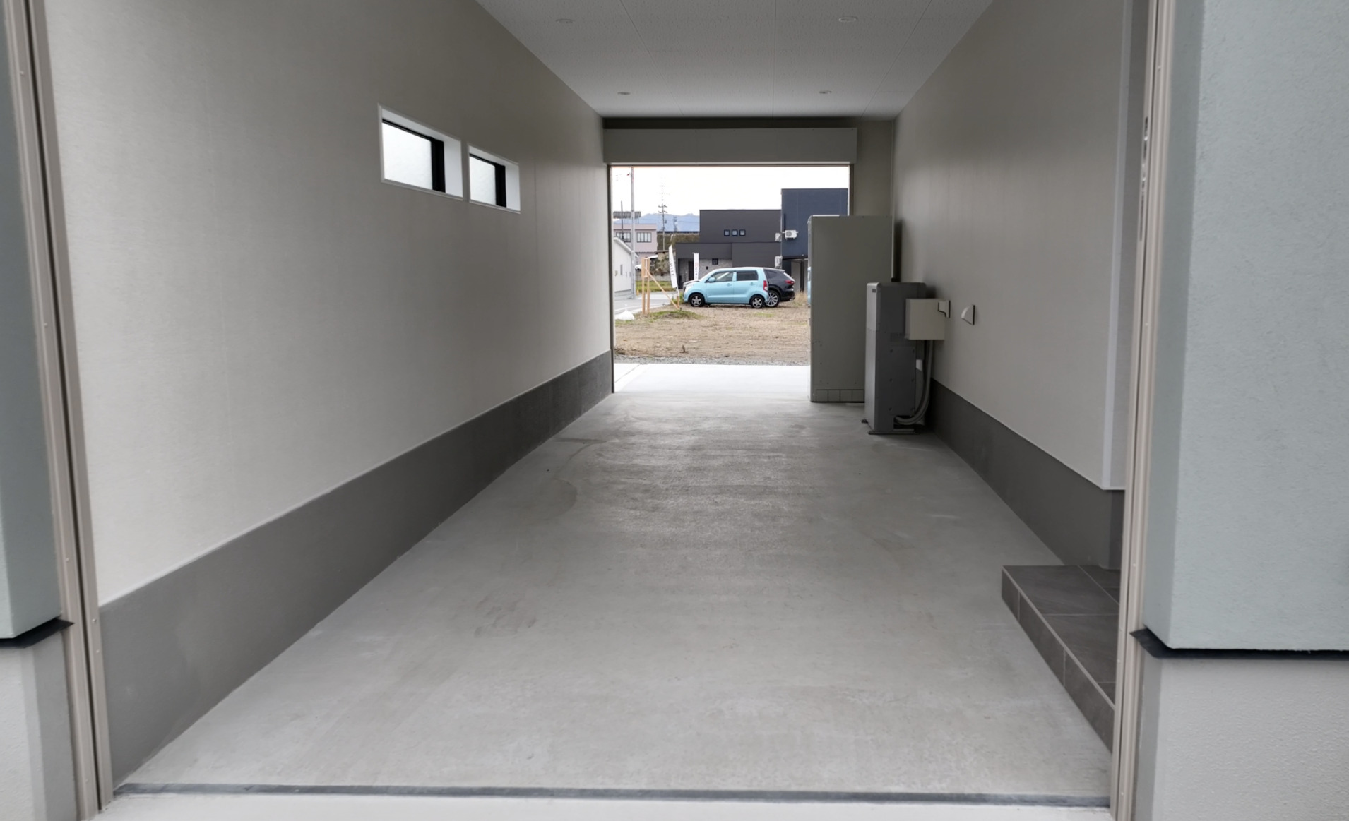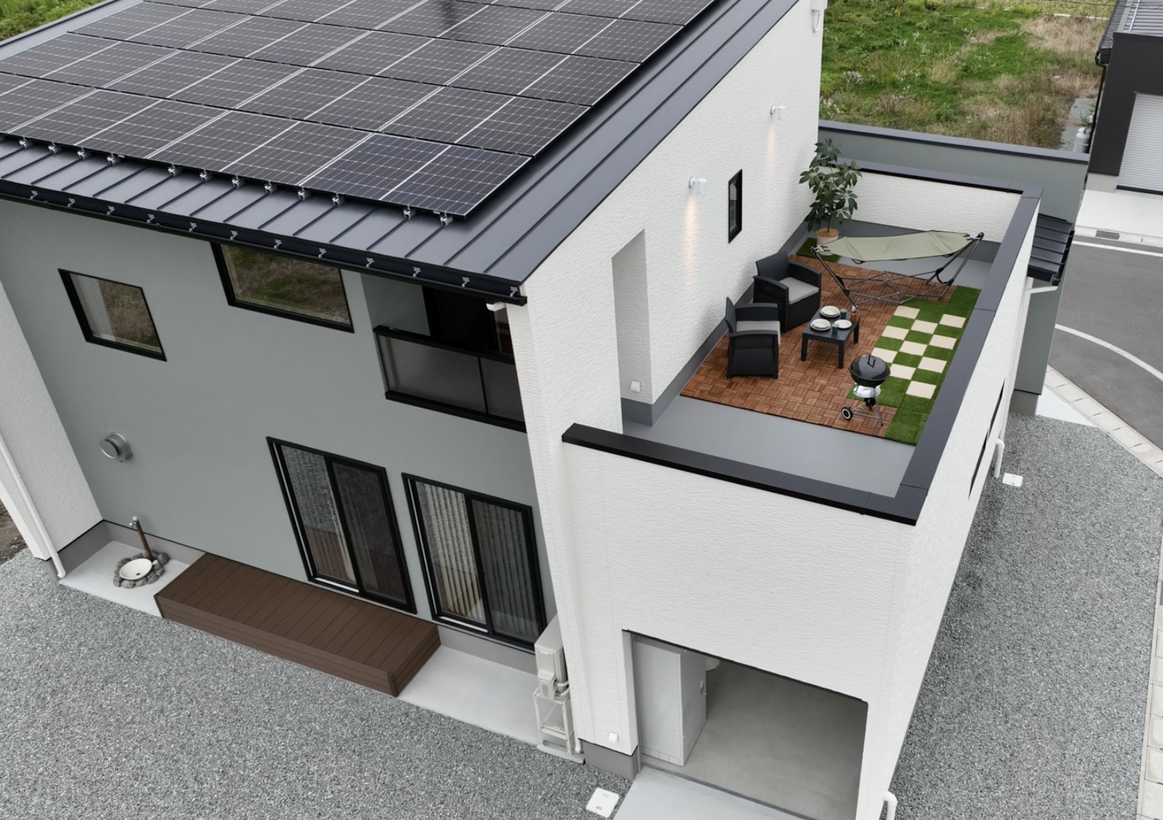 設備公営水道、公共下水道、ソーラーパネル、⼤容量蓄電池、エクリア(第一種換気、全館空調)、制振装置evoltz、システムキッチン、食洗乾燥機、ユニットバス、シャワー付洗面化粧台、エコキュート、インナーガレージ(電動シャッター)、樹脂サッシ複層ガラス等