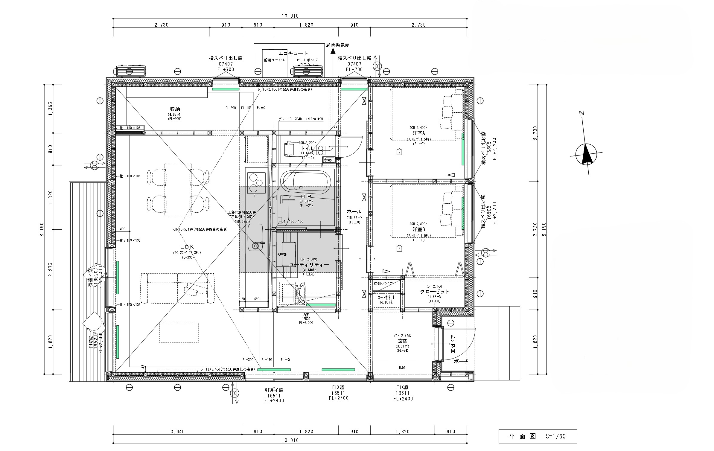 設備造作キッチン、造作カップボード、IHコンロ、パントリー、ユニットバス、造作洗面化粧台、タンクレストイレ、フル暖エアコン、床下エアコン、エコキュート、トリプルガラス樹脂窓、全部屋カーテン付等